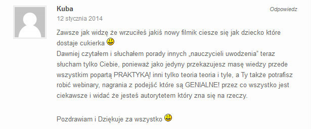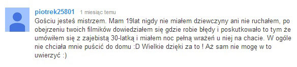 (…) Najbardziej zajebiste w tym kursie jest to, że dostajesz praktyczne przykłady. Nie musisz się bawić w analizy, zastanawiać. Ot starasz się mówić tak jak on mówi na nagraniach i laski zaczynają reagować.